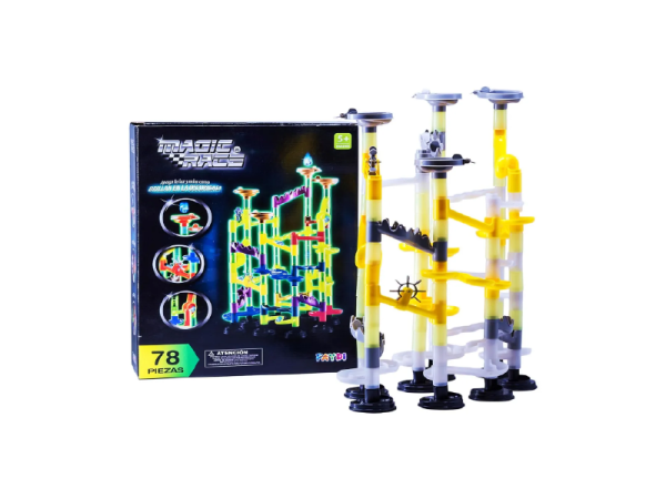Este juego es una buena manera de desarrollar la creatividad y destreza de una manera muy entretenida. No hay un solo modelo de armado, sino que inspira a la imaginación de cada niño. Es apto para todo tipo de canicas o bolitas pequeñas.